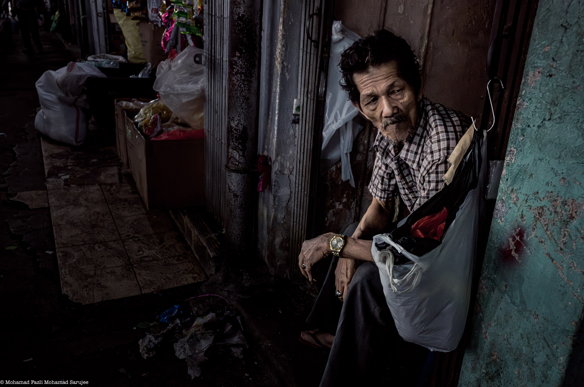 While wandering through the bustling Chow Kit market, I came across a man who seemed to be waiting for someone. Something about his posture caught my attention, and I took the shot from waist level. The market traffic was pretty intense, so I bumped my shutter speed to 1/500 to keep things sharp—especially since I was shooting on the move.