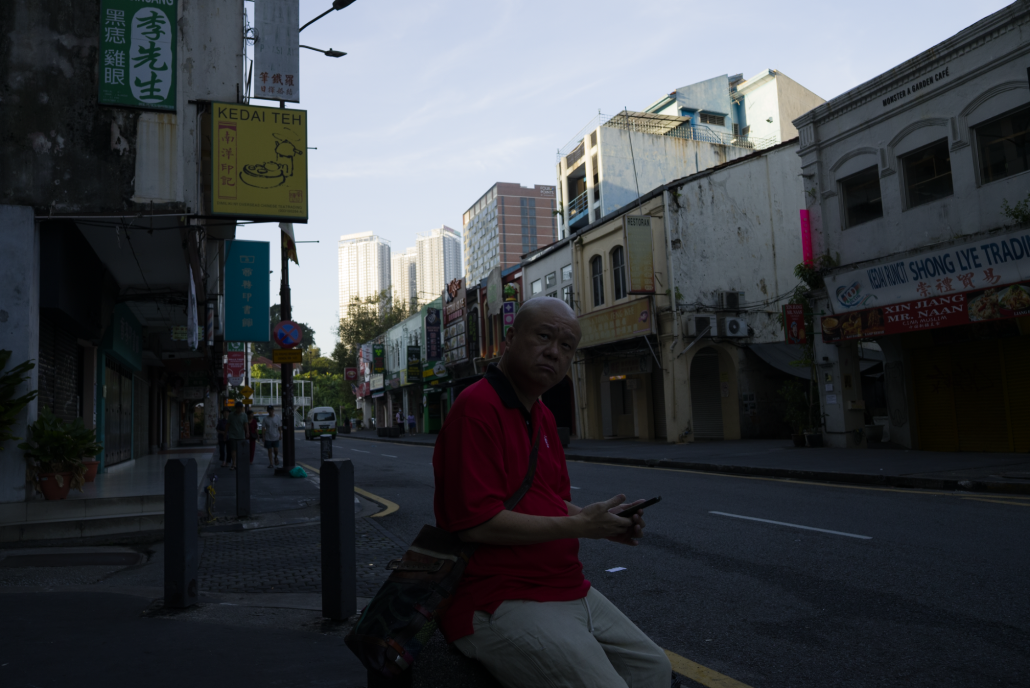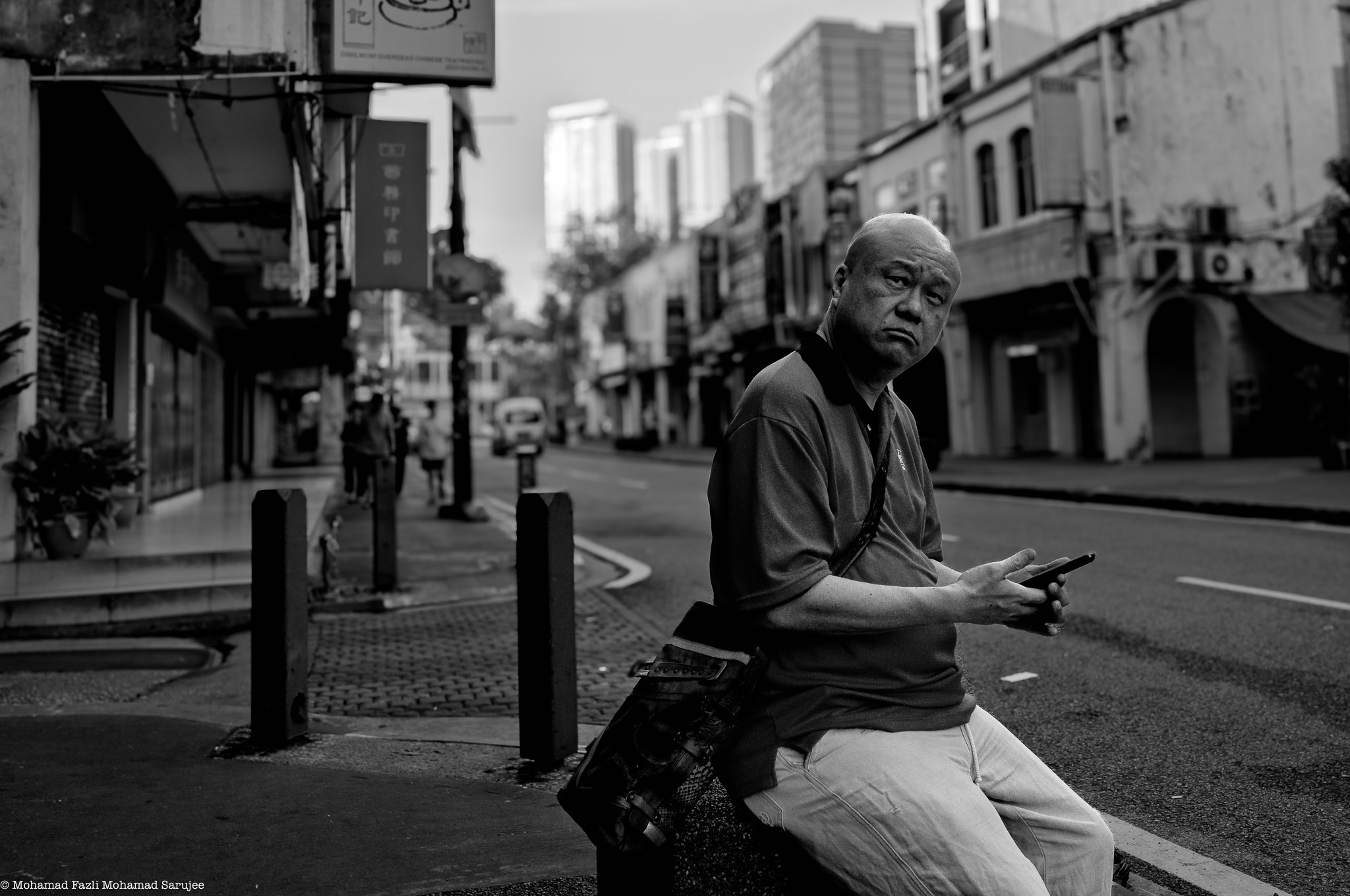 Man with phone sitting on urban street