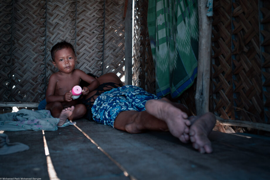 This image captures a tender moment of simplicity and survival in what looks like a Malaysian village setting. We see