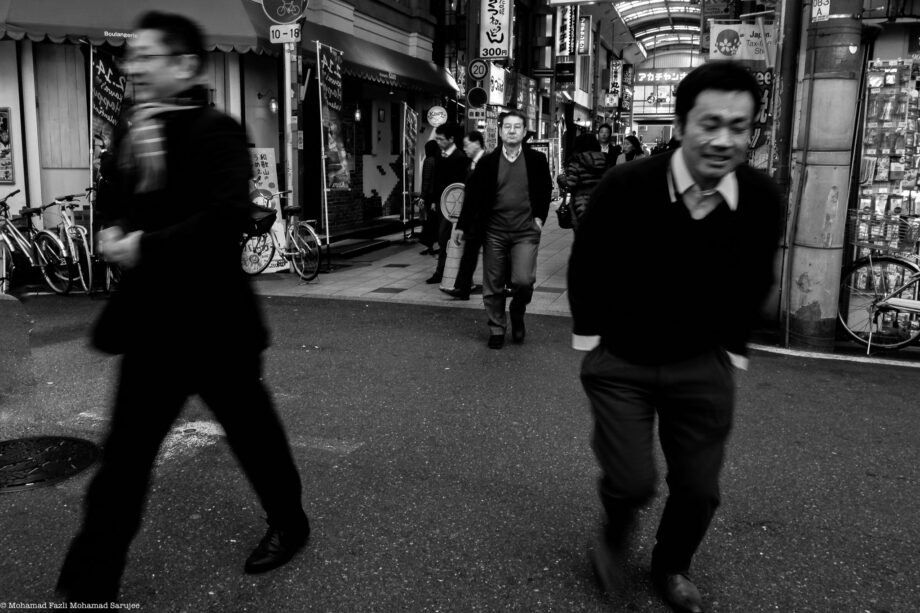 I took this photo in Osaka. It captures the morning rush where everyone is rushing to their offices (except for